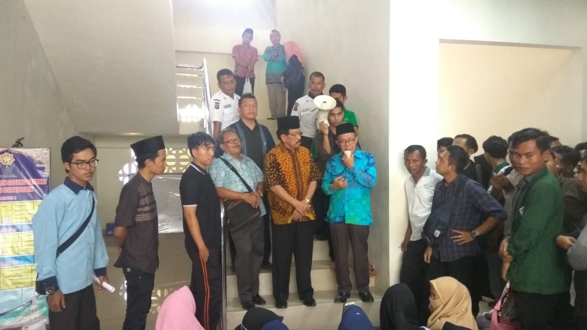 TEMUI MASSA. Dekan Fakultas Ushuluddin dan Studi Agama Aryad Sobbi Kesuma, didampingi Wakil Dekan I Himyari Yusuf, menemui para pengunjuk rasa yang menuntut oknum dosen Sosiologi Fakultas Ushuluddin UIN Raden Intan Lampung, Syaiful Hamali, dipecat karena diduga melakukan pelecehan seksual terhadap mahasiswinya, Jumat (28/12). (Triyadi Isworo)