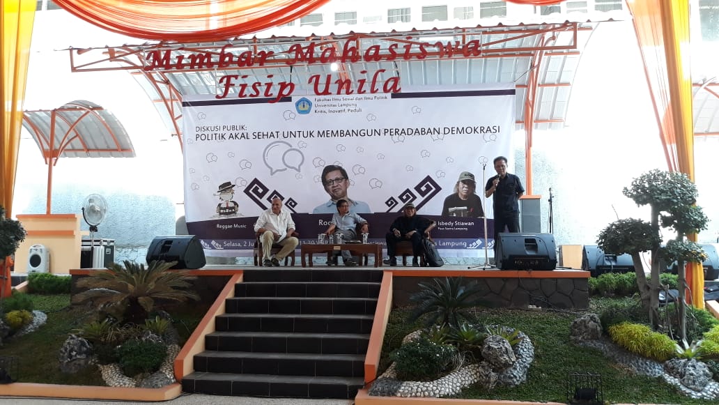 POLITIK AKAL SEHAT. Dekan FISIP Universitas Lampung Syarief Makhya (kanan) membuka diskusi publik dengan tema Politik akal sehat untuk membangun peradaban demokrasi, di FISIP Unila, Selasa (2/7). Akademisi sarat kontroversi, Rocky Gerung (kedua dari kiri), menyebarkan politik akal sehat kepada mahasiswa FISIP Unila.