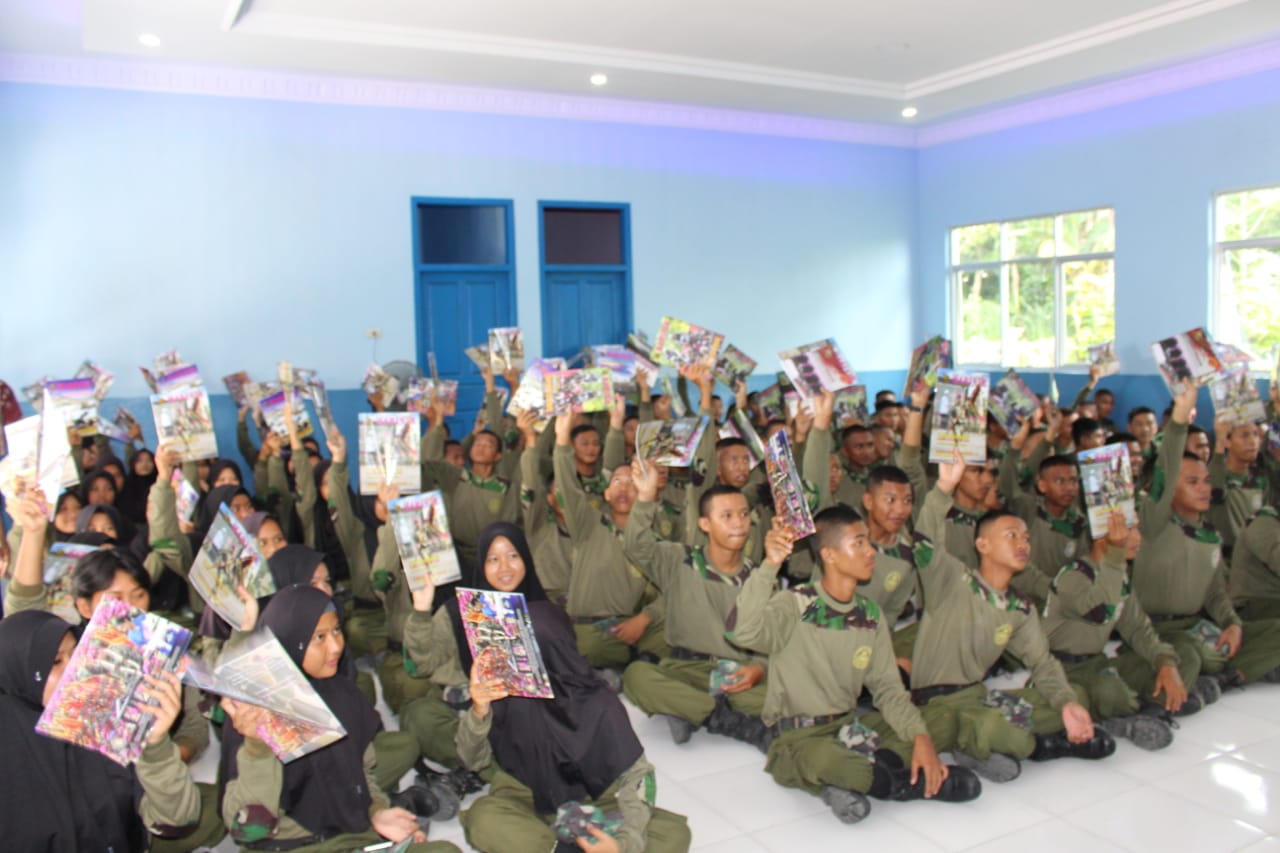 SOSIALISASI BELA NEGARA. Siswa SMKN 6 Bandar Lampung mengangkat majalah dan buku tulis pemberian Brigade Infanteri 4 Marinir dalam kegiatan pembinaan potensi maritim sosialisasi bela negara, di sekolah tersebut, Jumat (5/4). (ISTIMEWA)