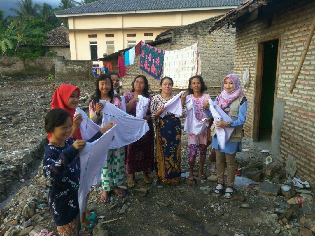 BAGIKAN JILBAB. Komunitas Sahabat Ceria menyalurkan 1.000 jilbab bagi korban tsunami di pesisir Lampung Selatan, Senin (14/1). (ISTIMEWA)