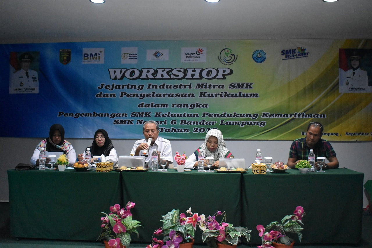 WORKSHOP JEJARING. Para pembicara workshop jejaring industri mitra SMK di Hotel Astoria Bandar Lampung, Rabu (4/9). Kepala SMKN 6 Bandar Lampung Weliza (kedua kiri), Kepala UPTD Dikmensus Wilayah I Sunardi (tengah), pengawas pembina SMKN 6 Sumarsih, dan perwakilan PT DRU Abri Gunarso (kanan). (ISTIMEWA)