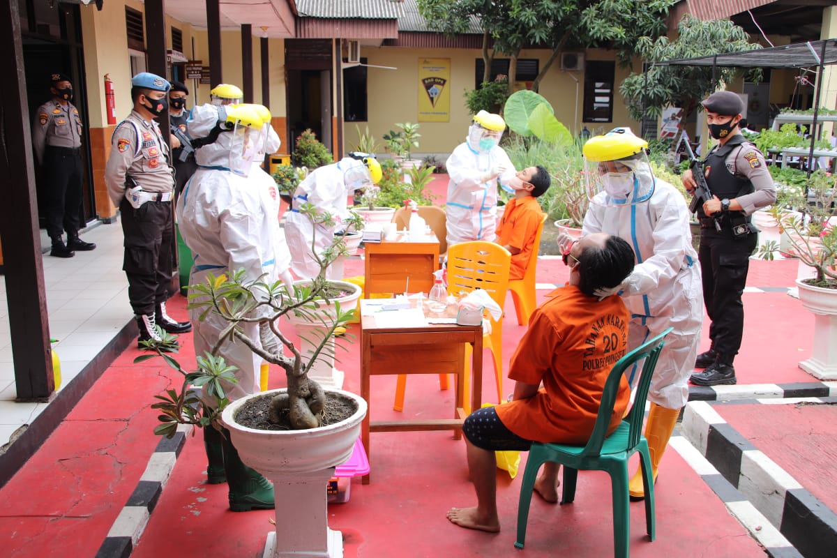 Para tahanan mengikuti rapid antigen yang diselenggarakan Polres Pringsewu dan Dinkes setempat, Rabu (13/1).