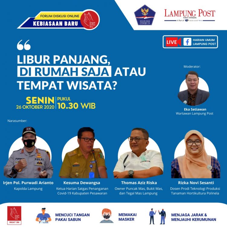 FGD online yang diselenggarakan Lampung Post kali ini menghadirkan empat pembicara dari berbagai bidang. Antara lain Kabid Humas Polda Lampung Kombes Pol Zahwani Pandra, Ketua Harian Satgas Penanganan Covid-19 Pesawaran Ir Kesuma Dewangsa, Pelaku Bisnis Pariwisata Owner Tegal Mas Thomas Aziz Riska, dan Dosen Prodi Teknologi Produksi Tanaman Holtikultura Polinela Rizka Novi Sesanti. (CR1/S1)