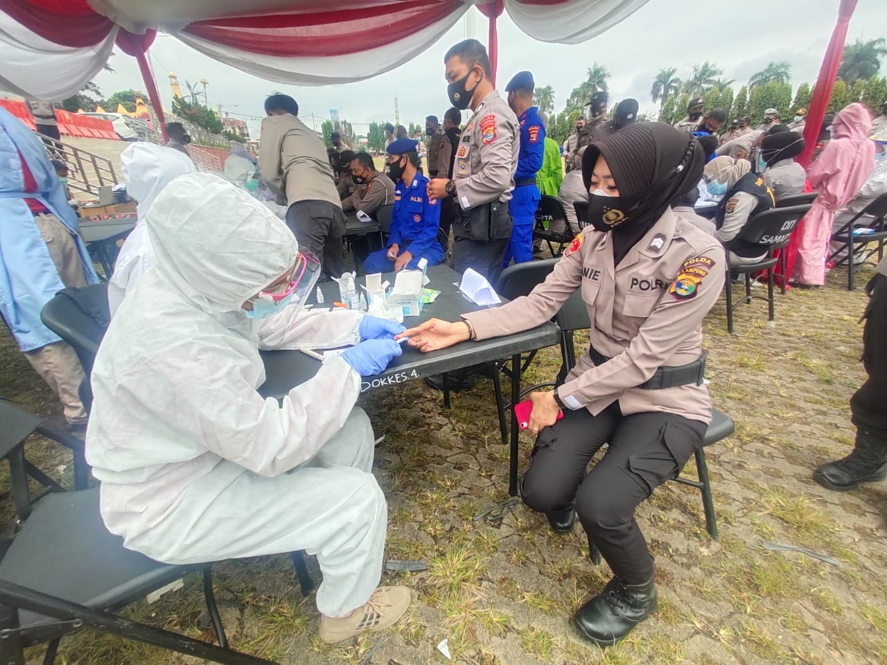 Polisi yang bertugas mengamanakan sedang menjalankan rapid test. (LAMPUNG POST/ASRUL S MALIK)