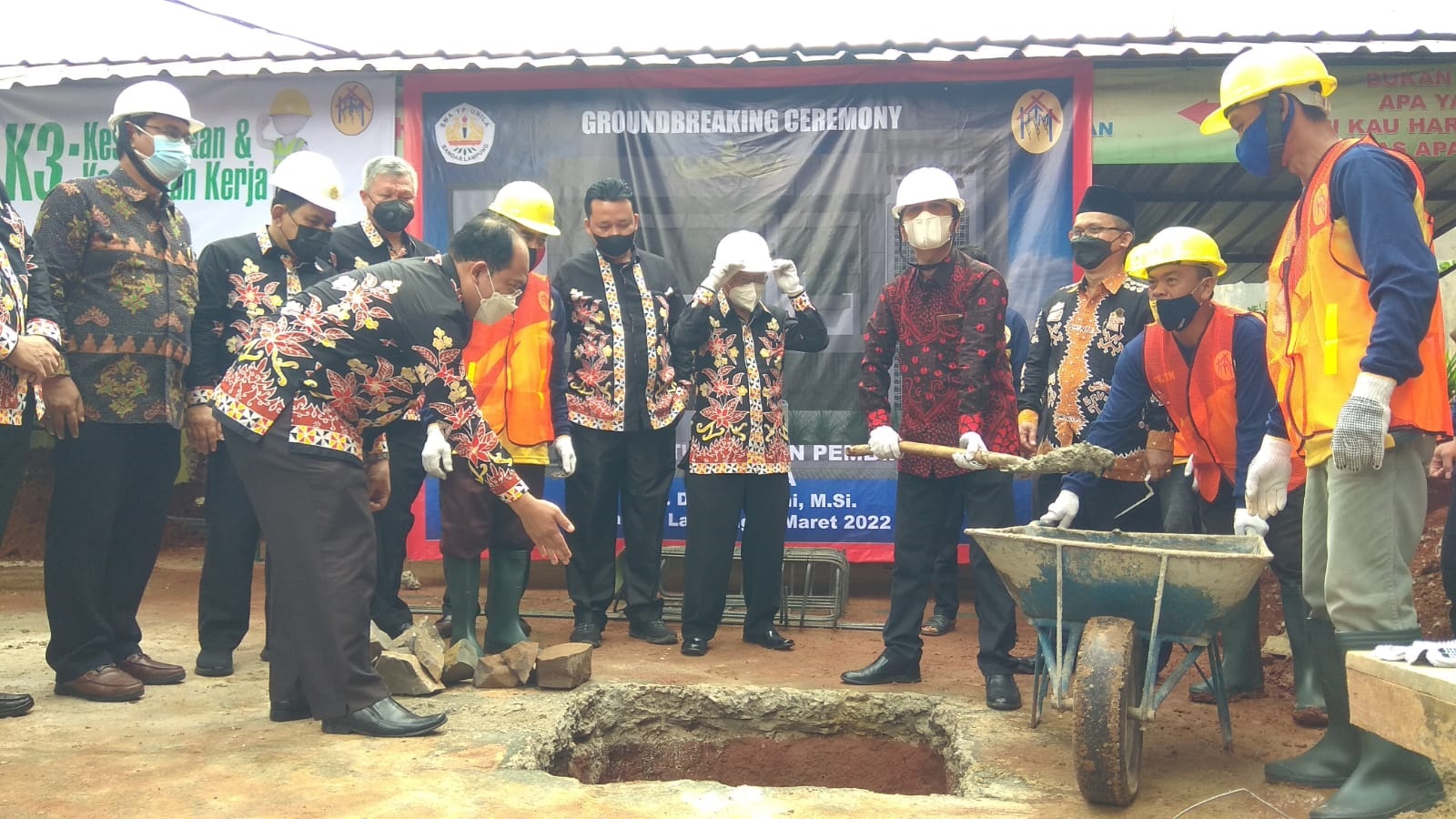 Rektor Unila Prof Karomani pada kegiatan peletakan batu pertama pembangunan student corner di YP Unila, Jumat (4/3). Keberadaan student corner atau kantin yang memenuhi standar representatif ini diharapkan membuat siswa nyaman dan tidak jajan di luar sekolah.