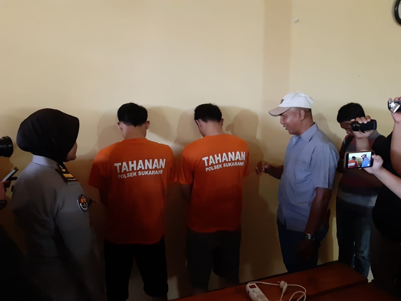 PEMBOBOL ATM. Dua Tersangka pembobol ATM, yakni Meidiansyah (24), warga Denteteladas, Tulangbawang, dan Suhaili (28), warga Kotaagung, Tanggamus, saat ekspos di Mapolsek Sukarame, Selasa (19/3). Mereka mengaku memiliki kemampuan membobol ATM dengan mempelajari cara menarik uang tanpa mengurangi jumlah saldo dari YouTube. LAMPUNG POST/IKHSAN DWI NUR SATRIO