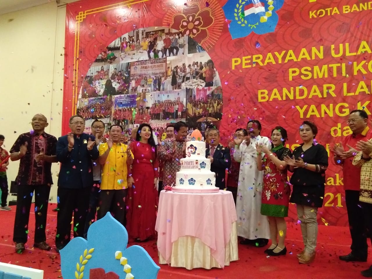 HUT KE-3 PSMTI. Ketua Paguyuban Sosial Marga Tionghoa Indonesia (PSMTI) Kota Bandar Lampung Rusli Taslim bersama pengurus dan Gubenur terpilih Arinal Djunaidi para perayaan ulang tahun ketiga PSMTI di Gedung Hakka Meta Sarana Telukbetung Bandar Lampung, Kamis (21/3). LAMPUNG POST/SUKISNO