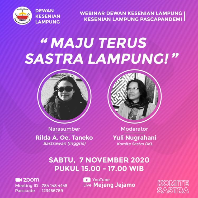 Udo mengatakan, webinar ini akan menghadirkan narasumber Rilda. A. Oe. Taneko, sastrawan Lampung yang bermukim di Inggris, dilakukan melalui Zoom Meeting (Meeting ID: 784 148 4445 dengan passcode: 123456789) pada Sabtu,7 Nopember 2020, pukul 15.00 – 17.00 WIB, dan disiarkan secara langsung di chanel Youtube DKL, Mejeng Jejamo.