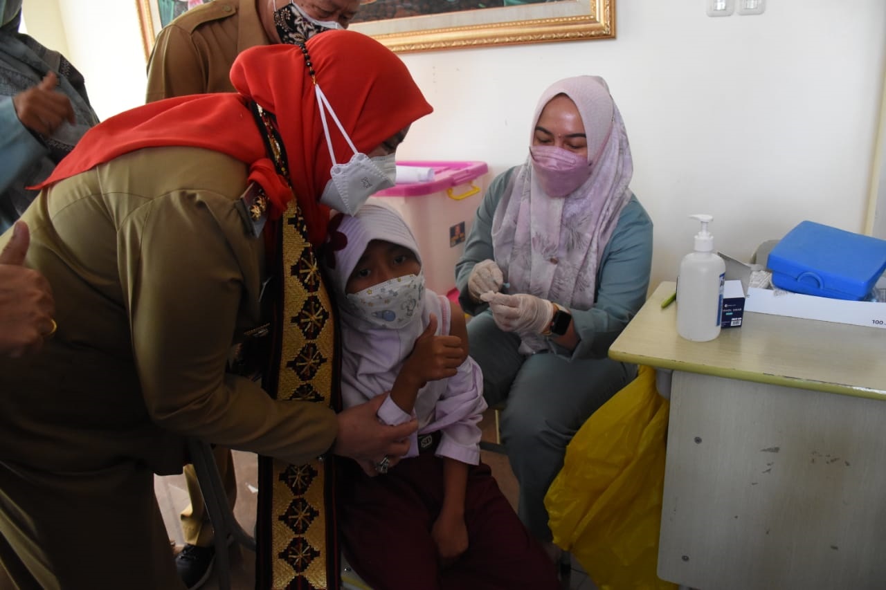 TINJAU VAKSIN ANAK. Wali Kota Bandar Lampung Eva Dwiana saat meninjau vaksinasi anak usia 6—11 tahun di Kota Bandar Lampung, Senin (21/12). Pemkot Bandar Lampung melalui puskesmas di seluruh kecamatan akan memberikan edukasi kepada orang tua anak agar memberikan izin anaknya mendapatkan vaksin Covid-19. ISTIMEWA