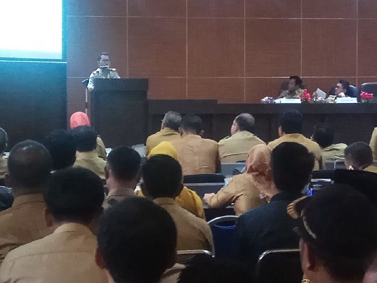 SOSIALISASI PTSL. Kepala ATR/BPN Kantor Pertanahan Lampung Selatan Sismanto memberikan sambutan dalam kegiatan sosialisasi program Pengadaan Tanah Sistematis Lengkap, di aula Rajabasa, kantor Bupati Lamsel, Senin (28/1). Kepala desa untuk tidak mendata lahan yang berjarak 200 meter dari tepi laut. (LAMPUNG POST/JUWANTORO)