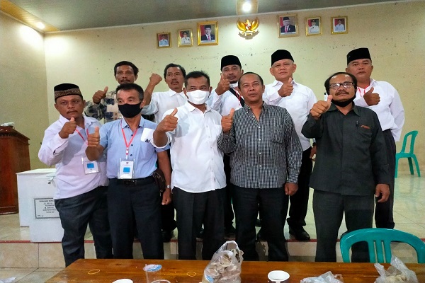 FOTO BERSAMA. Panitia dan peserta pilkades di Desa Simpangmesuji, Kecamatan Simpangpematang, Mesujim berfoto bersama usai penghitungan surat suara. LAMPUNG POST/RIDWAN ANAS