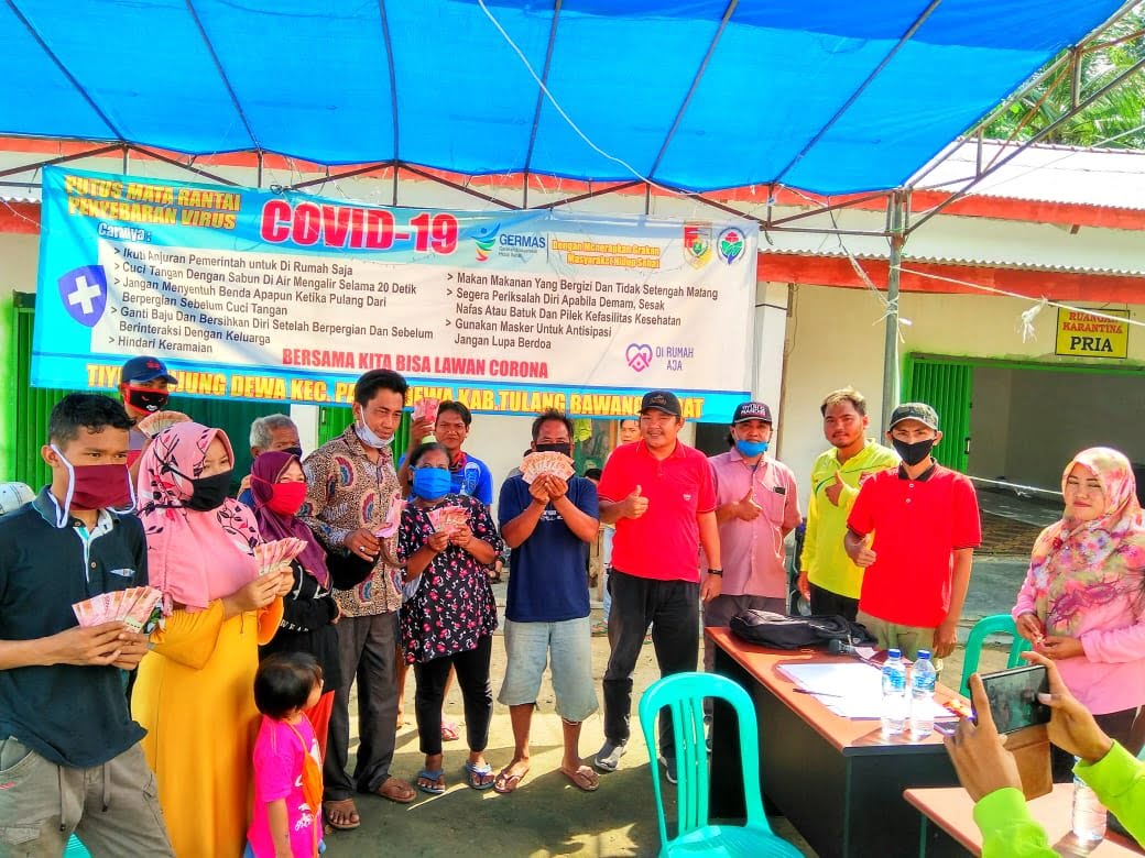 TERIMA BANTUAN. Warga terdampak Covid-19 di Tiyuh Bujungdewa menerima bantuan BLT-DD tahap kedua, Jumat (5/6). LAMPUNG POST/AHMAD SOBIRIN