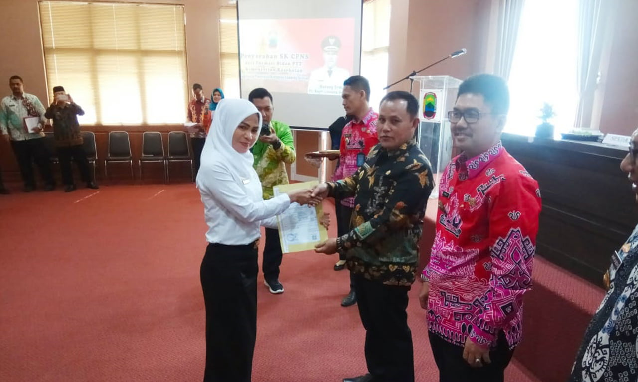 SERAHKAN SK. Plt Bupati Lampung Selatan Nanang Ermanto menyerahkan SK CPNS kepada 28 bidan PTT di Aula Krakatau Kantor Bupati Lamsel, Kamis (4/7). (LAMPUNG POST/JUWANTORO)