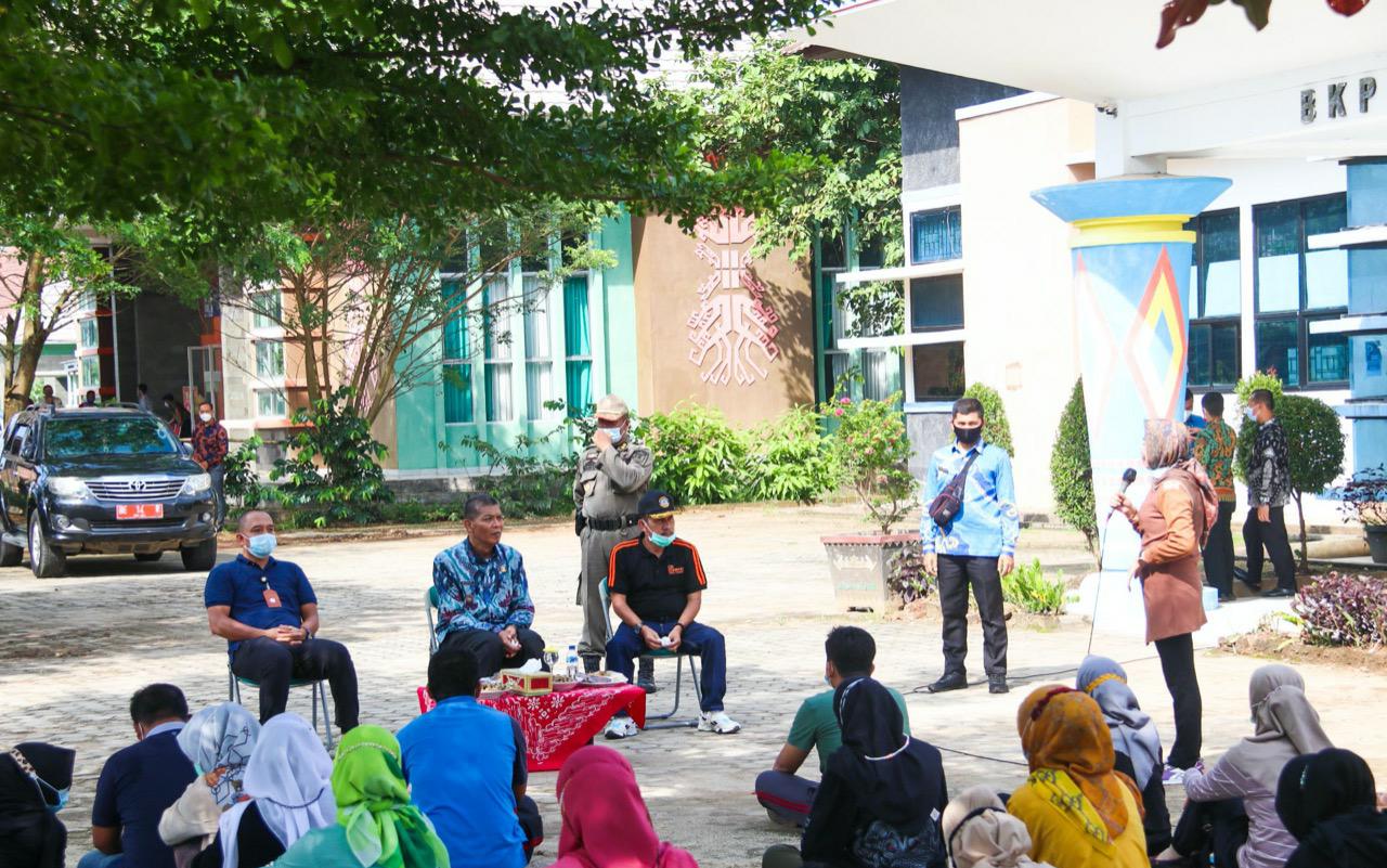 SILATURAHMI. Wakil Bupati Pesawaran S Marzuki berdialog dengan para pegawai Badan Kepegawaian dan Pengembangan Sumber Daya Manusia (BKPSDM) di halaman terbuka usai berolahraga, Jumat (5/3). Kegiatan silaturahmi tersebut sekaligus untuk saling mengenal. DOK HUMAS PEMKAB PESAWARAN