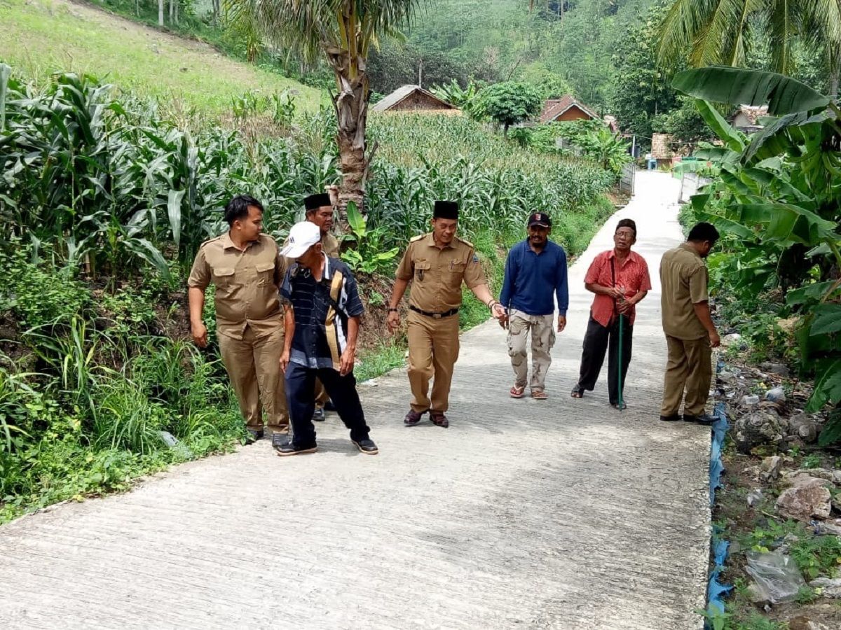 TINJAU PEMBANGUNAN. Kepala Desa Bakauheni, Kecamatan Bakauheni, Lampung Selatan, Sahroni meninjau hasil pembangunan cor beton yang berasal dari dana desa tahun 2018. (LAMPUNG POST/AAN KRIDOLAKSONO)