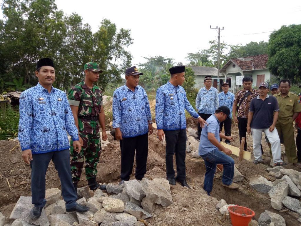 PEMBANGUNAN WARDES. Camat Sragi, Lampung Selatan, Bibit Purwanto didampingi Kepala Desa Margajasa Alex Sansu, babinsa, dan pendamping desa melakukan peletakan batu pertama pembangunan warung desa, Senin (16/7). LAMPUNG POST/ARMANSYAH
