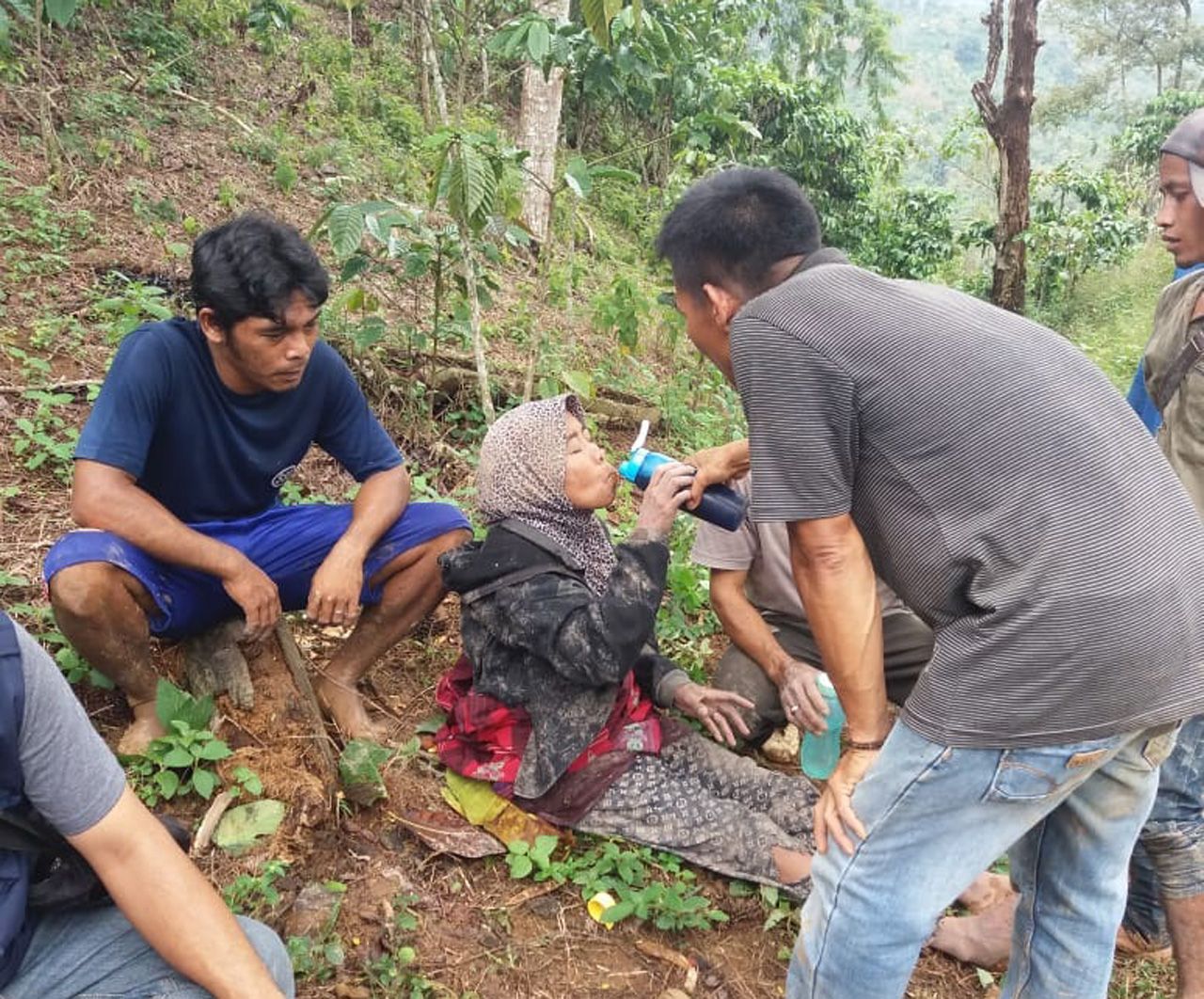 PERTOLONGAN PERTAMA. Warga memberikan pertolongan pertama pada korban longsor yang dievakuasi, Sabtu (16/2). Kini korban sudah mendapat perawatan di salah satu rumah sakit di Bukitkemuning. (ISTIMEWA)