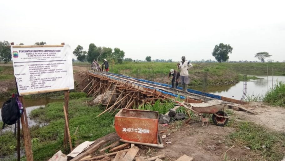 DIPERBAIKI. Setelah ambrol, jembatan penyeberangan SPP Desa Pulautengah, Kecamatan Palas, Lampung Selatan, diperbaiki melalui anggaran tanggap darurat, Kamis (19/12). ARMANSYAH