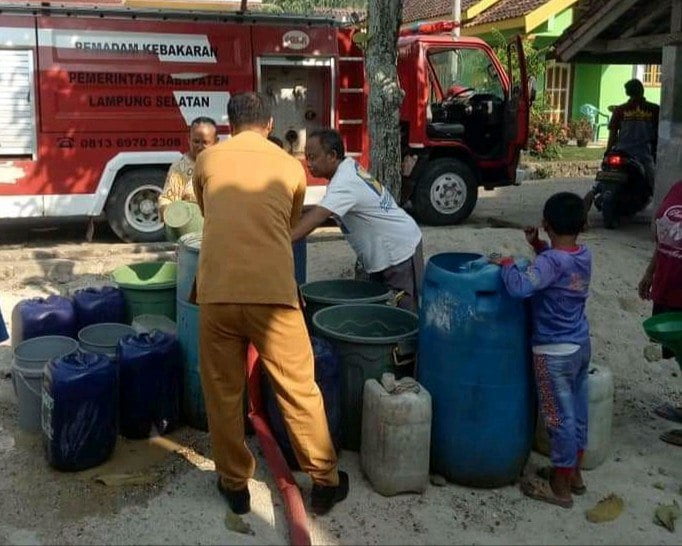 BANTUAN AIR. Warga Simpang Sumur, Desa Hatta, Lampung Selatan, mulai kesulitan mencari air bersih, Senin (21/10). LAMPUNG POST/AAN KRIDOLAKSONO