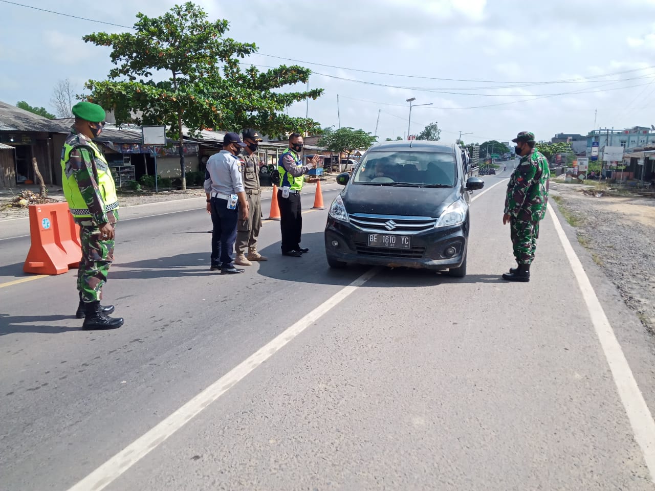 PERIKSA. Petugas gabungan tengah memberhentikan kendaraan yang melintas di Jalan Lintas Timur Sumatera (Jalinsum) Mesuji, Senin (17/5). Kendaraan yang melintas masih lengang. LAMPUNG POST/RIDWAN ANAS