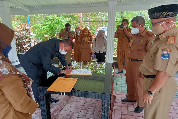 LANTIK KADIS. Sekretaris Kota (Sekkot) Metro, Bangkit Haryo Utomo saat melangsungkan sertijab kadis PUTR dan kadis Lingkungan Hidup, Senin (11/10). Pembangunan dan kebersihan akan kembali mendapat prioritas untuk dilaksanakan. LAMPUNG POST/BAMBANG PAMUNGKAS