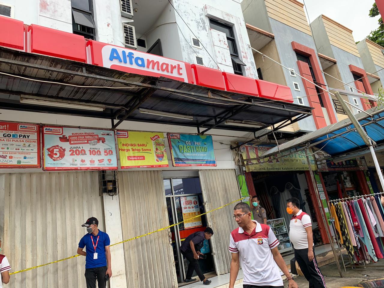 GARIS POLISI. Personel Polres Lampung Utara melakukan olah TKP dan memasang garis polisi di minimarket yang dibobol pencuri di Jalan Jenderal Sidirman Kotabumi, Jumat (27/3). LAMPUNG POST/HARI SUPRIYONO