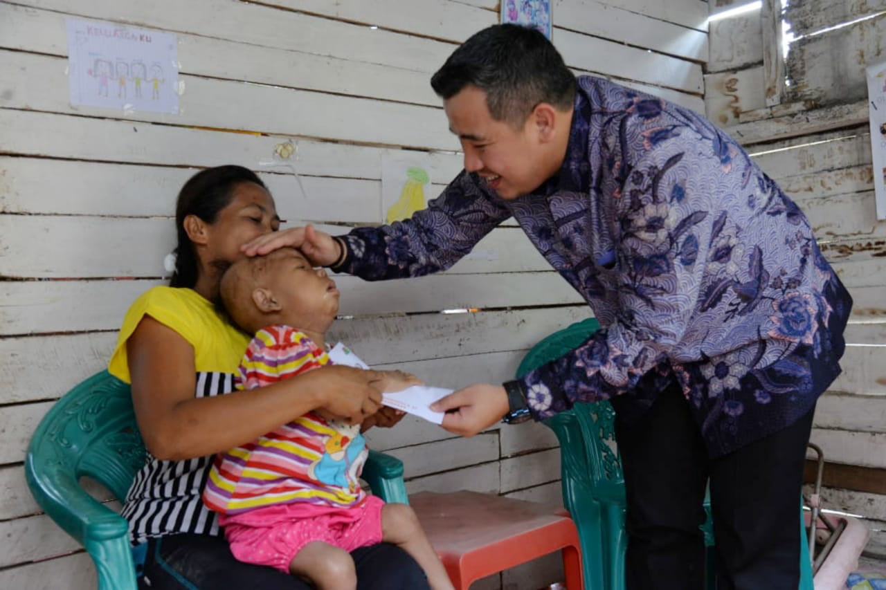BERI PERHATIAN. Bupati Pesawaran Dendi Ramadhona memberikan bantuan kepada Irma (18), Dusun Sukaraja II, Desa Sukaraja, Kecamatan Gedongtataan, Pesawaran, yang mengalami kelainan pertumbuhan sejak bayi, Minggu (13/10). (DOKUMENTASI HUMAS PEMKAB PESAWARAN)