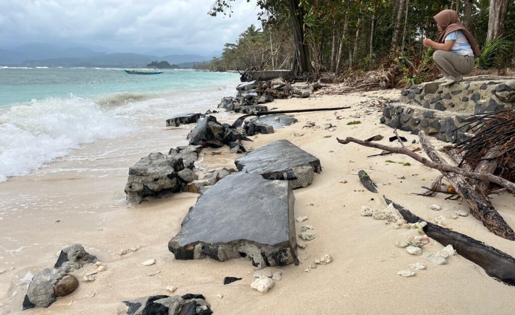 Talut Pantai Pekon Seray, Kecamatan Pesisir Tengah, Kabupaten Pesisir Barat, ambruk diterjang ombak. Foto dibidik Senin (30/12/2024). Talut sepanjang puluhan meter itu baru selesai pembangunannya sekitar tiga bulan lalu. Foto: LAMPOST.CO/SALDA ANDALA
