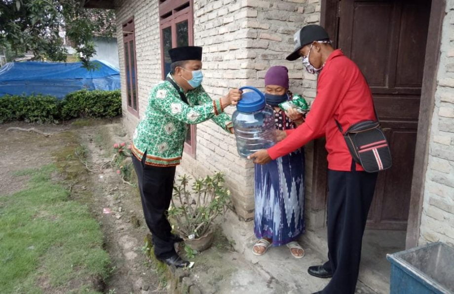 BAGIKAN ALAT. Kepala Desa Palasaji, Kecamatan Palas, Lampung Selatan, Herri Susanto saat membagikan alat cuci tangan kepada masyarakat, Jumat (1/5). LAMPUNG POST/ARMANSYAH