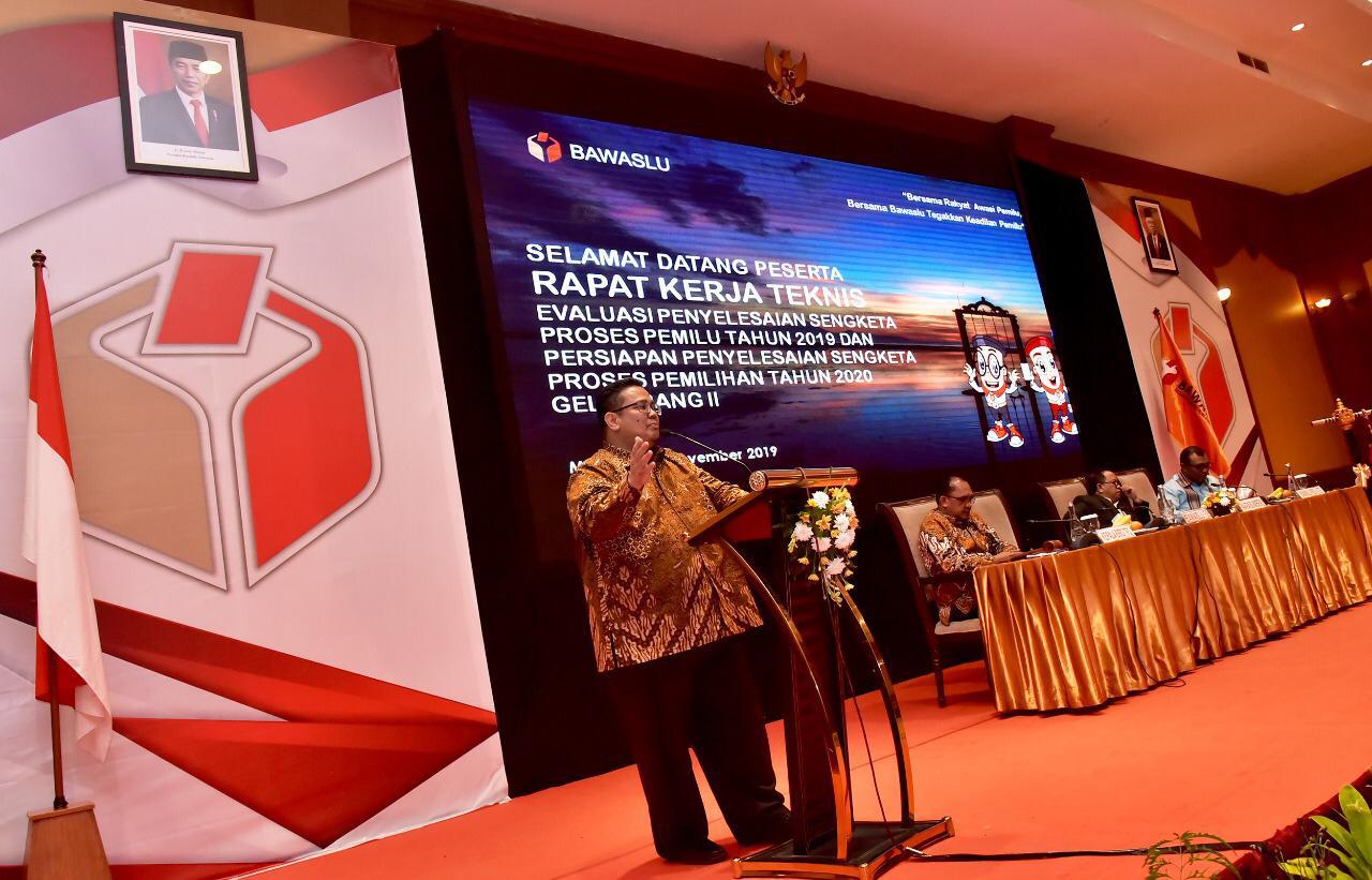 Anggota Bawaslu Rahmat Bagja saat pidato di acara Rakernis Evaluasi Penyelesaian Sengketa Pemilu Tahun 2019 dan Persiapan Penyelesaian Sengketa Proses Pemilu Tahun 2020 Gelombang II, Mataram, Selasa (5/11).