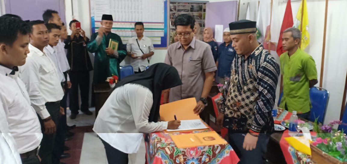 PENGANGKATAN PPK. Ketua KPU Tubaba Ismanto Ahmad menyaksikan penandatanganan pengangkatan PPK penambahan untuk Pemilu tahun 2019 di aula KPUD setempat, Rabu (2/1). n LAMPUNG POST/AHMAD SOBIRIN
