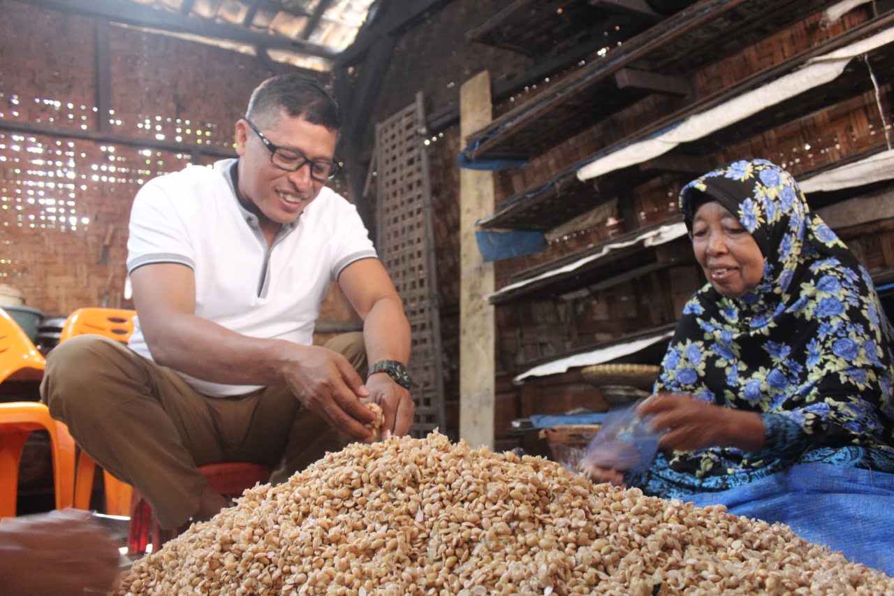 DENGARKAN KELUHAN WARGA. Ketua DPRD Bandar Lampung Wiyadi berbincang dengan Pujiem, salah satu pengusaha tempe di daerah Gunungsulah, Bandar Lampung, Kamis (12/12). Pujiem mengeluh belum pernah mendapat bantuan sedikitpun dari pemerintah. n LAMPUNG POST/IST