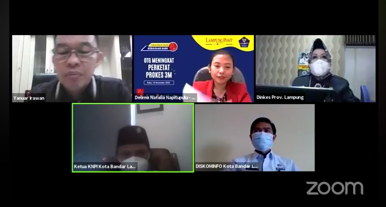 WEBINAR LAMPUNG POST. (Dari kiri seiring jarum jam) Ketua Komisi V DPRD Lampung Yanuar Irawan, Redaktur Medsos Lampung Post Delima Natalia Napitupulu, Kadis Kesehatan Provinsi Lampung Reihana, juru bicara Satgas Penanganan Covid-19 Kota Bandar Lampung Ahmad Nurizki Erwandi, dan Ketua DPD KNPI Kota Bandar Lampung Iqbal Ardiansyah saat webinar Lampung Post tentang OTG Meningkat Perketat Prokes 3M, Rabu (18/11).