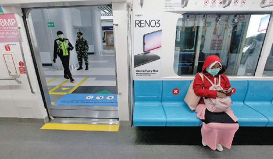 DISIPLIN PROTOKOL COVID-19. Prajurit TNI AD berjaga di peron Stasiun MRT Bundaran HI, Jakarta, Rabu (27/5). Presiden Jokowi juga meminta TNI dan Polri menambah pasukan di wilayah-wilayah yang masih memiliki tingkat penularan Covid-19 tinggi.  MI/SUSANTO