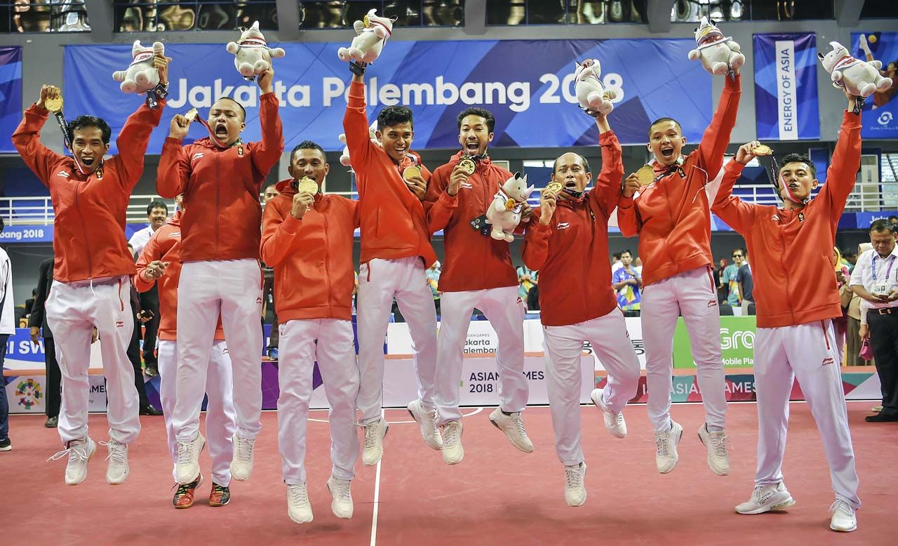 GEMBIRA.Tim sepak takraw putra Indonesia berpose bersama memperlihatkan emas seusai di final quadrant Asian Games 2018 di GOR Ranau, Jakabaring Sport City (JSC), Palembang, Sumatera Selatan, Sabtu (1/9), mengalahkan Jepang 2-1. (ANTARA/INASGOC/NOVA WAHYUDI )