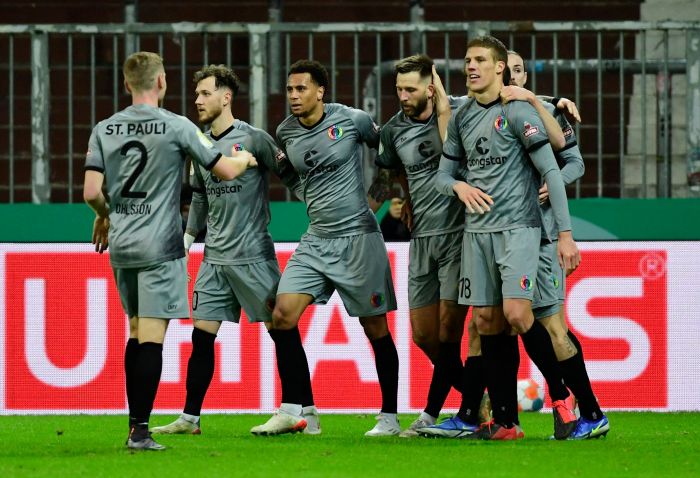 Para pemain St Pauli melakukan selebrasi usai mencetak gol ke gawnag Borussia Dortmund di laga DFB Pokal, Rpada abu (19/1) dini hari WIB.