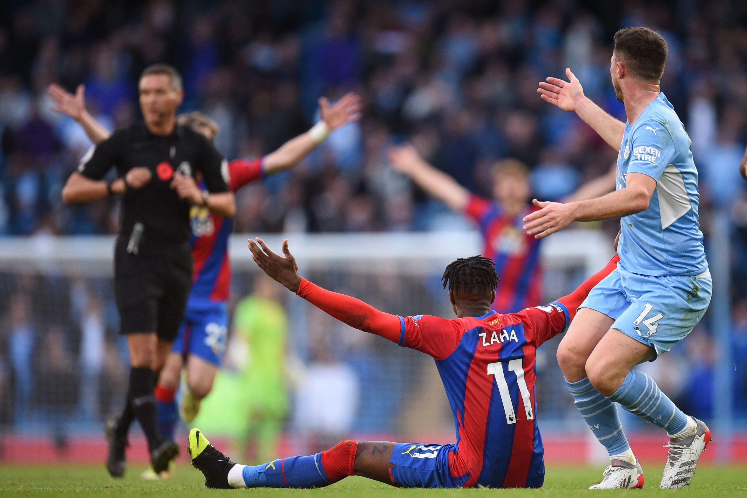 Bek Manchester City, Aymeric Laporte, mendapat kartu merah usai menjegal penyerang Crystal Palace, Wilfiried Zaha.