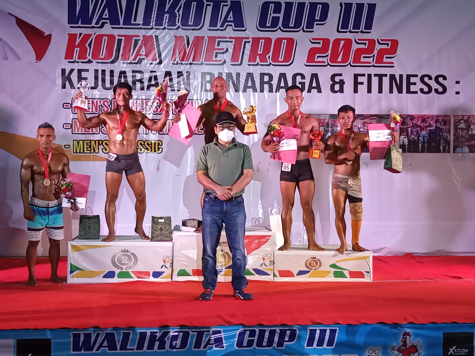 KEJUARAAN BINARAGA. Wali Kota Metro Wahdi Sirajuddin usai memberikan piagam penghargaan pada Kejuaraan Binaraga dan Fitness kelas Men's Classic Wali Kota Cup 2022, Minggu (19/6). Kejuaraan tersebut menjadi ajang menggali potensi binaraga di Metro. LAMPUNG POST/BAMBANG PAMUNGKAS