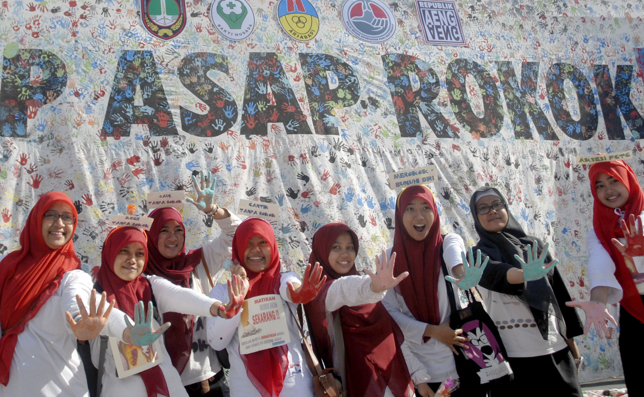 Sejumlah remaja berfoto di depan baliho anti asap rokok saat kampanye anti asap rokoh yang diselenggarakan Balai Besar Kesehatan Paru Masyarakat (BBKPM) Surakarta serta Asosiasi Rumah Sakit dan Balai Kesehatan Paru Indonesia di Solo, Jateng, Minggu (1/6). Dalam acara tersebut juga diselenggarakan pengukuhan rekor MURI atas terkumpulnya 30.000 cap telapak tangan pada spanduk kampanye "STOP ASAP ROKOK". ANTARA FOTO/Andika Betha/ed/nz/14