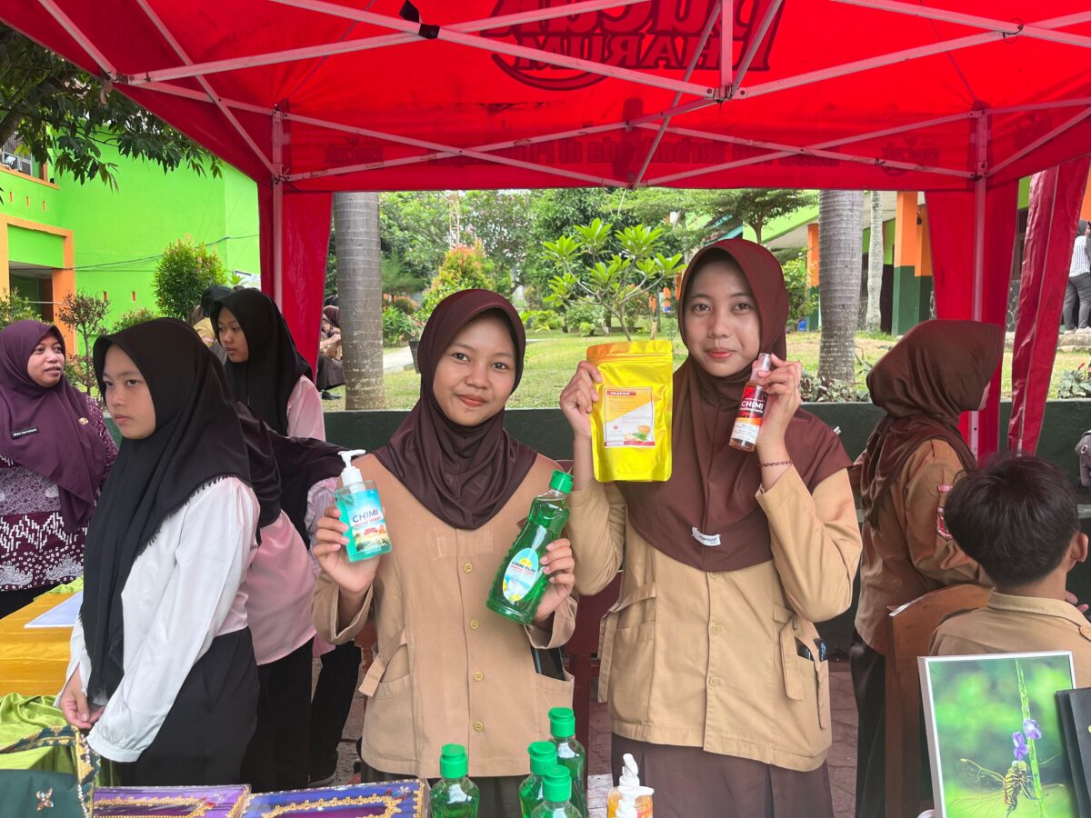 Salah satu siswa kelas X Teknik Kimia Industri, Rafika Tara, nampak antusias menjaga stand pameran jurusannya. Dia bersama teman-temannya memperkenalkan beragam produk hasil praktik siswa, seperti sabun cuci piring, hand sanitizer, dan minuman jahe bubuk kepada pengunjung.
