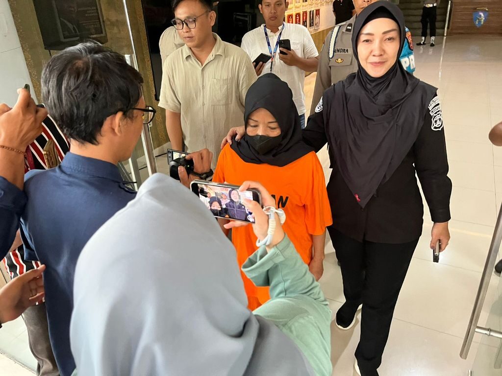Tersangka kasus dugaan penipuan dan penggelapan, Yani Sumiyati (58), warga Bandar Lampung, saat rilis pers ungkap kasus Polresta Bandar Lampung dan jajaran di Mapolresta setempat, Sabtu (15/11/2025). Foto: Lampost.co/Asrul Septian malik