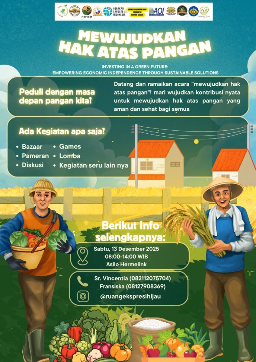 Fransiska dari Asosiasi Petani Organik Lampung mengungkapkan pihaknya terus berupaya meningkatkan atensi dan kesadaran publik untuk mewujudkan pertanian berkelanjutan yang adaptif dan berkeadilan. Mereka menyelenggarakan kegiatan “Mewujudkan Hak Atas Pangan” pada 13 Desember 2025 di Asilo Hermelink, Jalan Z.A. Pagar Alam No.18, Gedong Meneng, Kec. Rajabasa, Bandar Lampung. Waktu kegiatan sejak pukul 08.00 hingga 14.00 WIB.