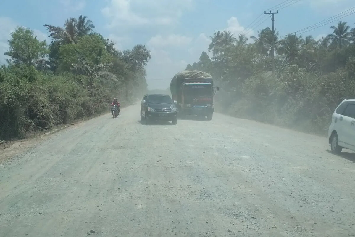 Kendaraan melintasi Jalan rusak dan berdebu di Jalan Ir. Sutami Lampung Selatan, beberapa waktu lalu. (Foto: Antaranews Lampung/Ardiansyah.