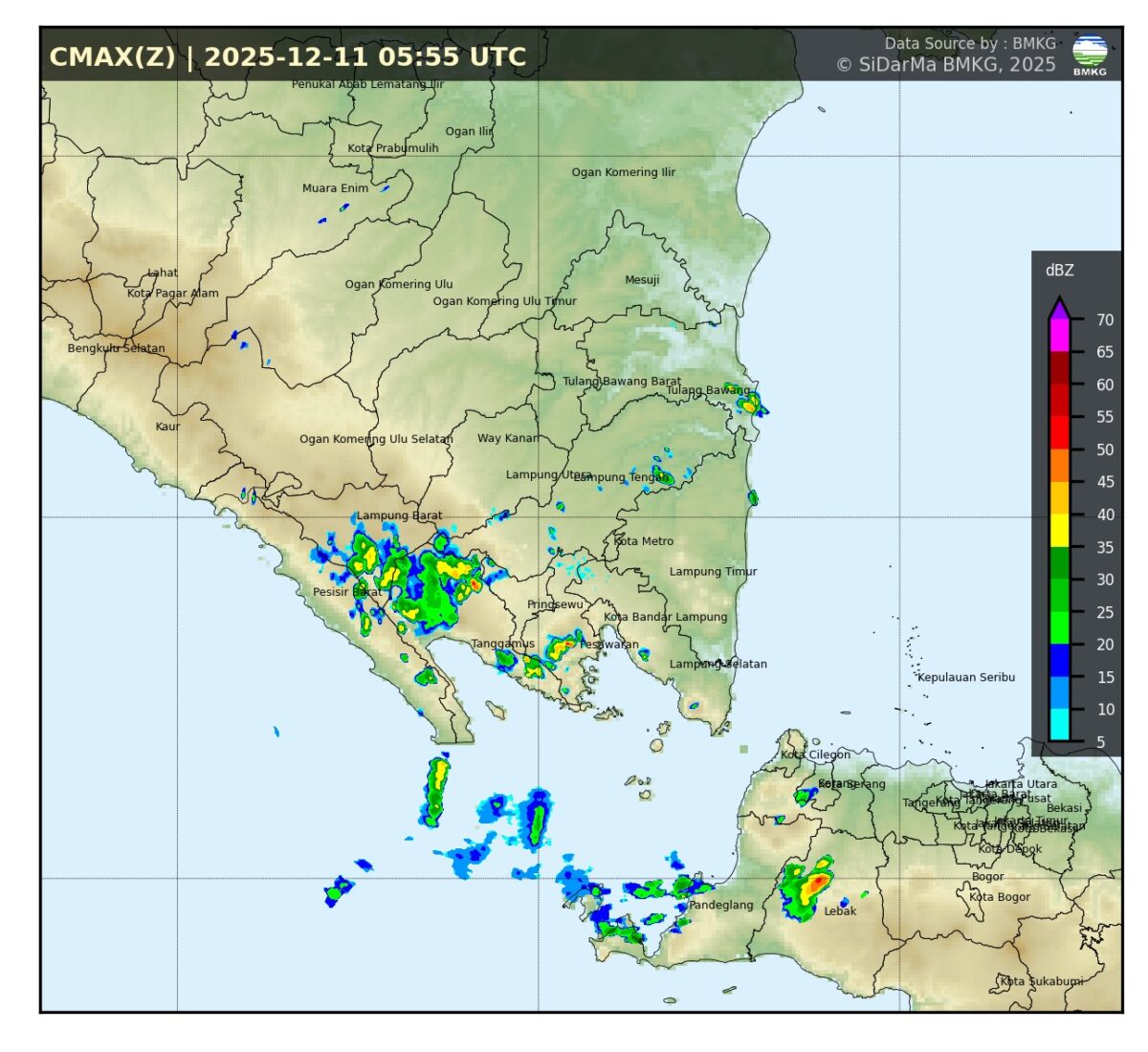 BMKG menyebut potensi hujan lebat hingga sangat lebat dapat terjadi di sejumlah daerah, meliputi Pesisir Barat, Lampung Barat, Tanggamus, Way Kanan, Lampung Utara, Pringsewu, Pesawaran, Bandar Lampung, Lampung Selatan, Lampung Timur, Metro, Lampung Tengah, Tulang Bawang Barat, Tulang Bawang, dan Mesuji.