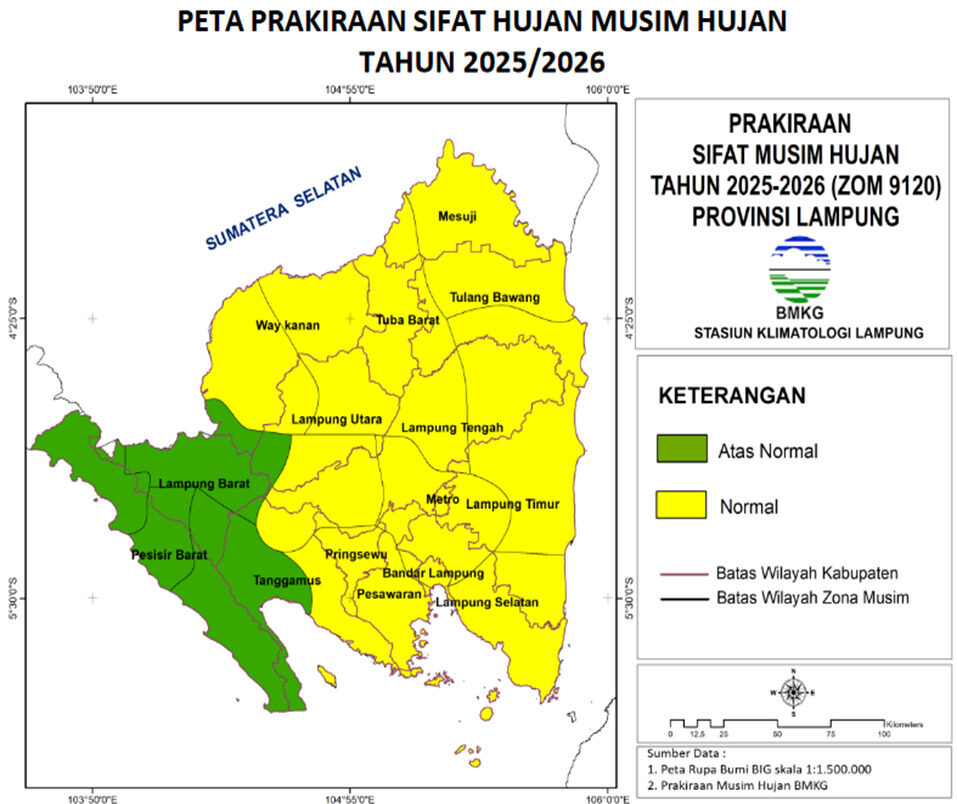 Bandar Lampung (Lampost.co) — Badan Meteorologi, Klimatologi, dan Geofisika (BMKG) memprediksi wilayah Indonesia bagian selatan, termasuk Lampung, akan mengalami curah hujan tinggi hingga sangat tinggi pada November 2025 hingga Januari 2026. Kondisi itu berpotensi meningkatkan risiko bencana hidrometeorologi di sejumlah daerah.