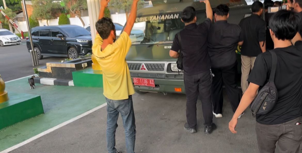 Usai melakukan penahanan, salah satu pria yang mengaku suami salah satu tersangka protes. Pria berbaju kuning dan menggendong anak, berteriak di depan kantor Kejari Bandar Lampung.