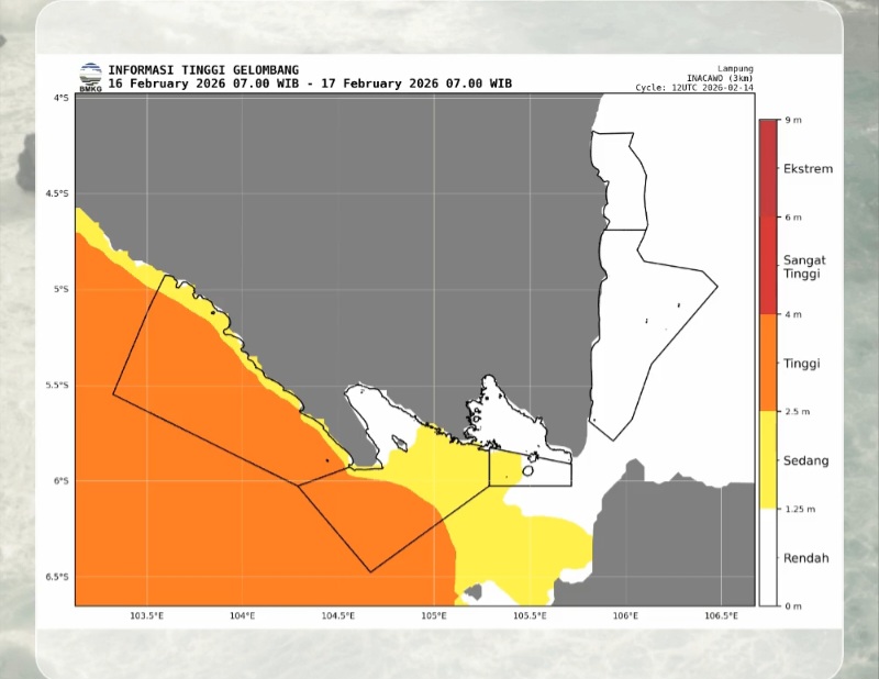 Bandar Lampung (Lampost.co) – Badan Meteorologi, Klimatologi, dan Geofisika (BMKG) mengeluarkan peringatan dini terkait potensi gelombang tinggi sejumlah Perairan Lampung. Gelombang tinggi tersebut berlaku mulai 16 Februari 2026 pukul 07.00 WIB hingga 19 Februari 2026 pukul 07.00 WIB.