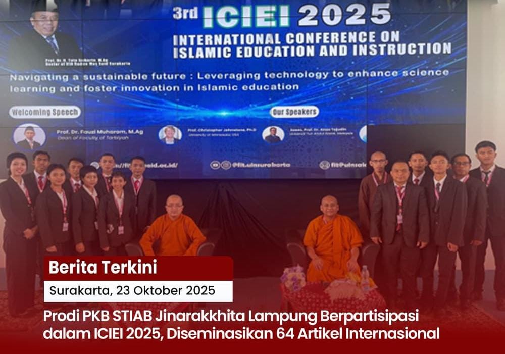 Surakarta (Lampost.co) – Program Studi Pendidikan Keagamaan Buddha (PKB) Sekolah Tinggi Ilmu Agama Buddha (STIAB) Jinarakkhita Lampung terus menunjukkan kiprah akademiknya di tingkat global. Kampus ini menjadi Co-Host dalam The 3rd International Conference on Islamic Education and Instruction (ICIEI) 2025 yang diselenggarakan oleh Fakultas Tarbiyah UIN Raden Mas Said Surakarta, Rabu (23/10/2025).