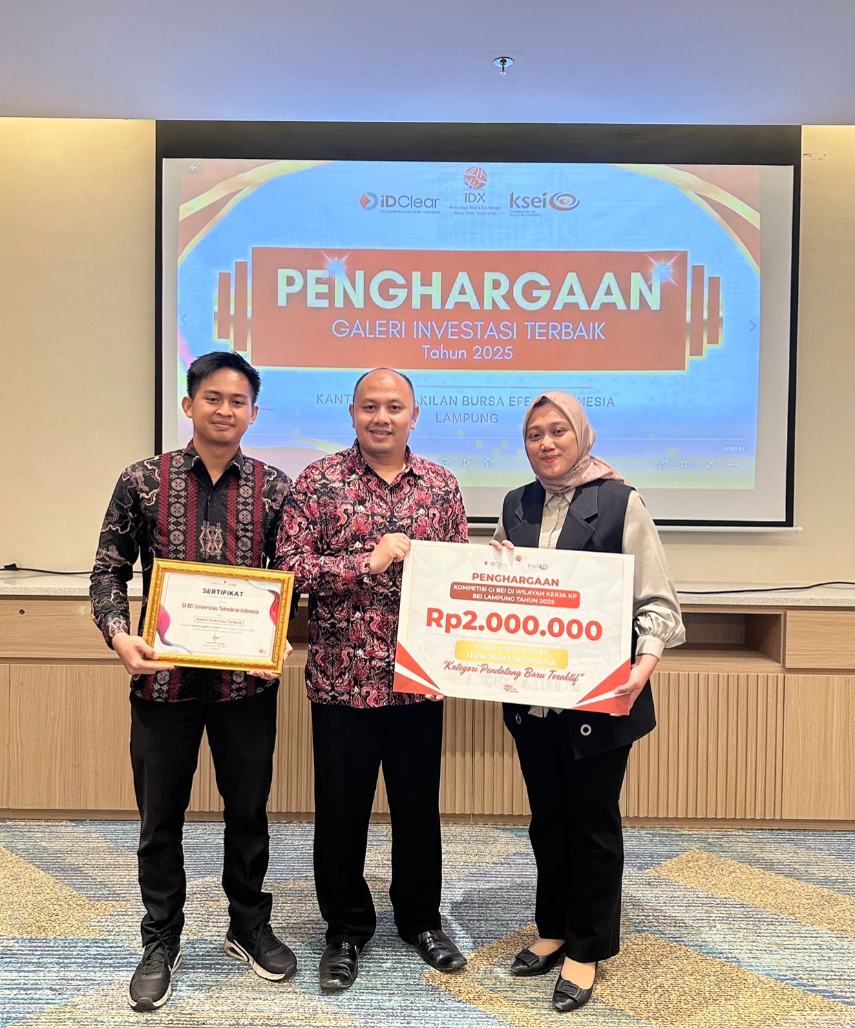 Bandar Lampung (Lampost.co)—Galeri Investasi Universitas Teknokrat Indonesia kembali menorehkan prestasi membanggakan dengan meraih gelar Galeri Investasi Terbaik Tingkat Regional Lampung. Penghargaan ini diberikan pada ajang Penghargaan Galeri Investasi 2025 yang diselenggarakan Bursa Efek Indonesia (BEI) Provinsi Lampung belum lama ini.