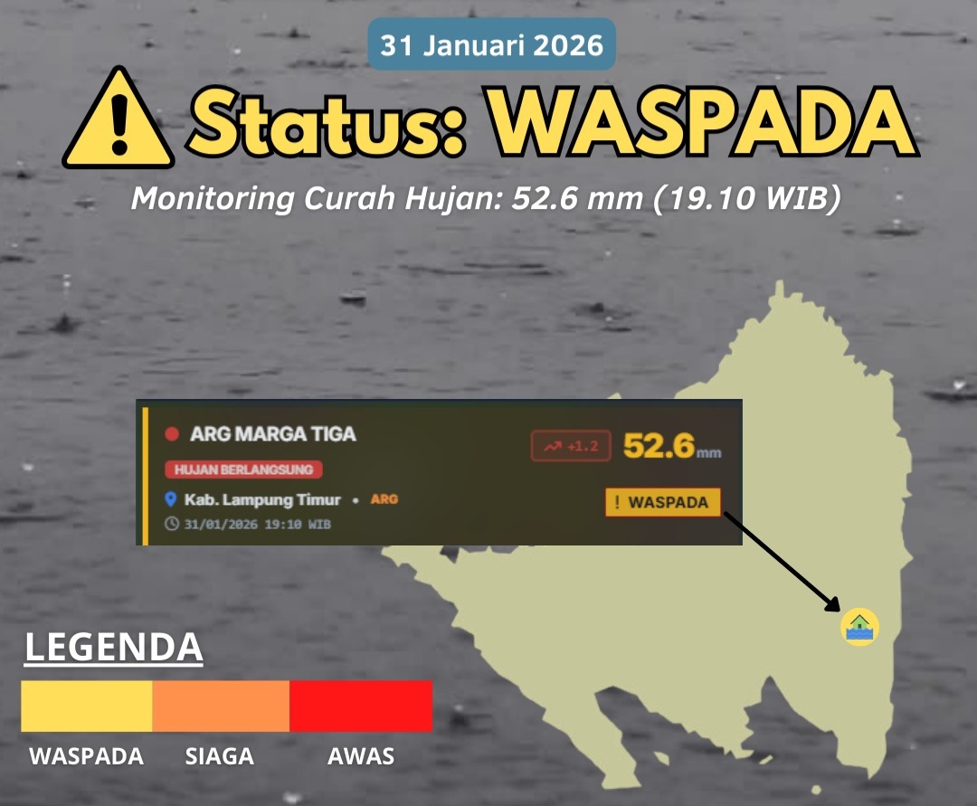 “Peringatan dini dampak hujan sedang – lebat Kabupaten Lampung Timur, Sabtu, 31 Januari 2026 pukul 19.10 WIB dengan status waspada. Monitoring curah hujan 52.6 mm,” himbau BMKG dalam siarannya.